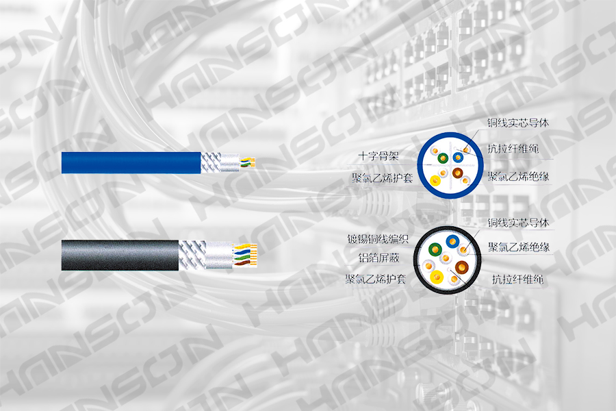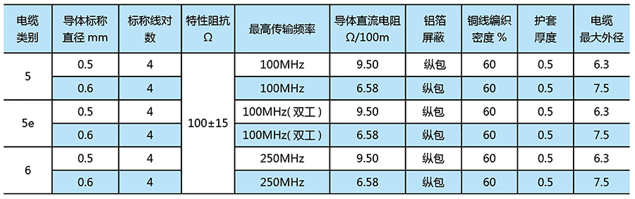絕緣:HDPE(高密度聚乙烯材料) 屏蔽有一層單面復(fù)合鋁箔和一層編織層組成 絕緣的斷裂延伸率≥300% 色譜:藍(lán)/藍(lán)白、橙/橙白、綠/綠白、棕/棕白 線芯:四芯絞合(四對(duì)) 護(hù)套:常規(guī)護(hù)套采用70℃阻燃聚氯乙烯